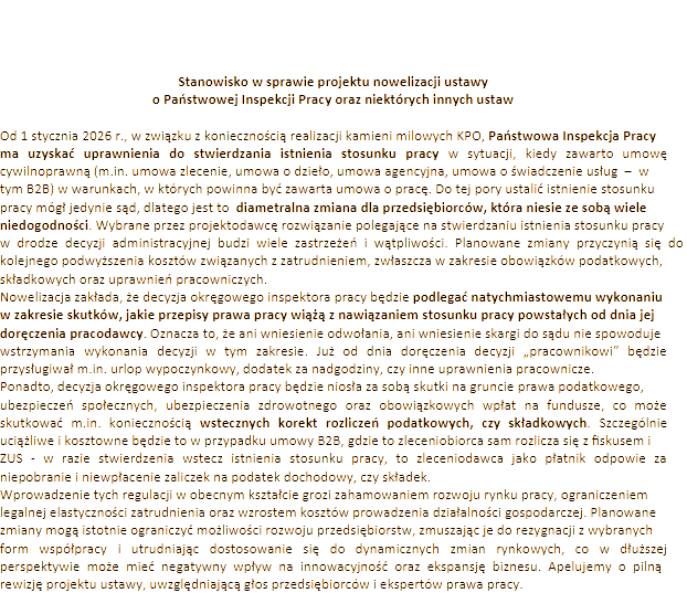 Poniżej przedstawiamy stanowisko w sprawie projektu nowelizacji ustawy o Państwowej Inspekcji Pracy oraz niektórych innych ustaw, które zostało skierowane do administracji rządowej.