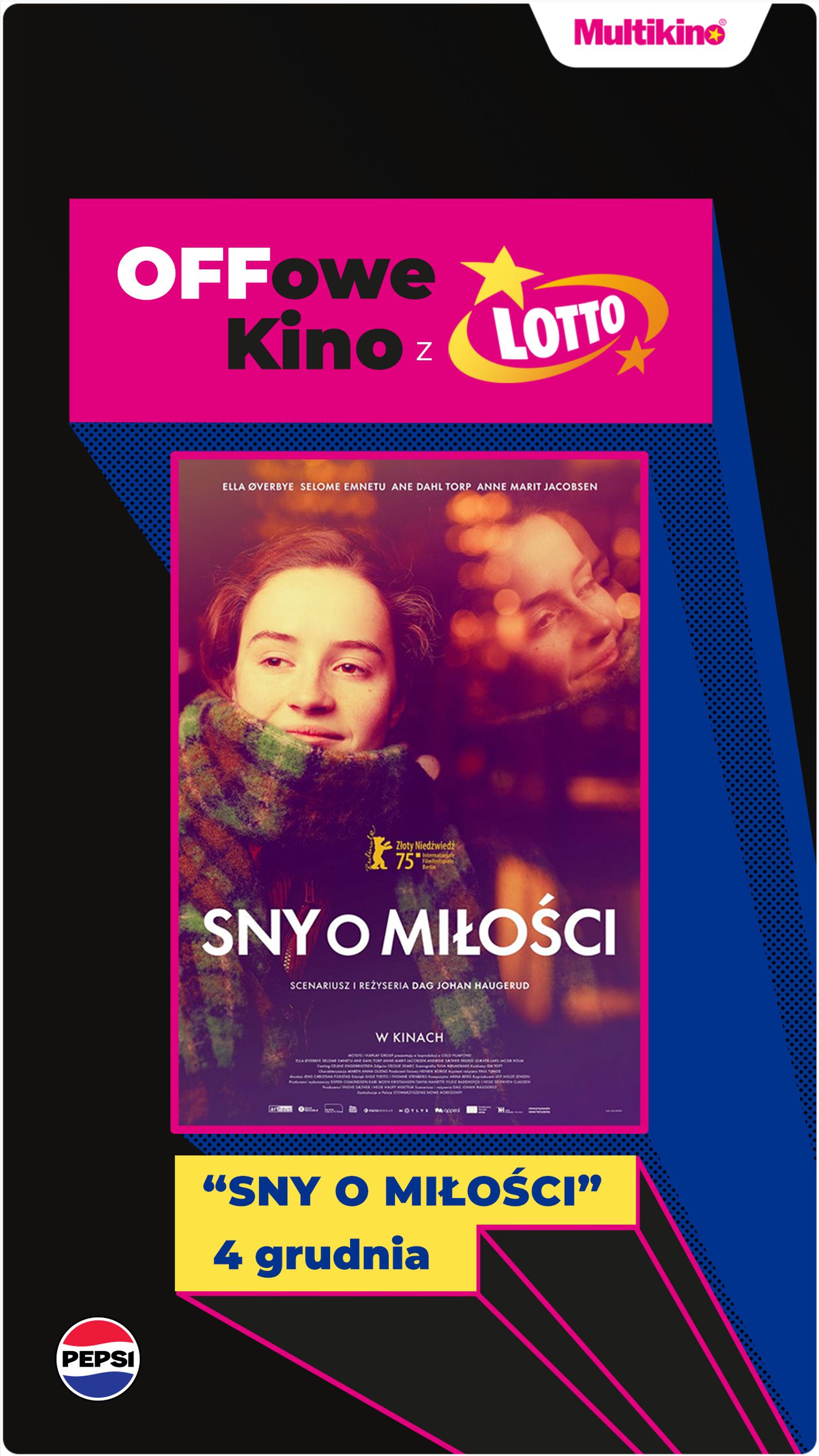 Projekt „OFFowe Kino z Lotto” w grudniu ponownie wzbogaci regularny repertuar o filmy festiwalowe i artystyczne produkcje. 4 grudnia we wszystkich kinach sieci Multikino będzie można zobaczyć film „Sny o miłości”, 11 grudnia „Left-handed girl”, 18 grudnia „Angel's egg”, a 25 grudnia „Błysk diamentu śmierci”.