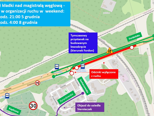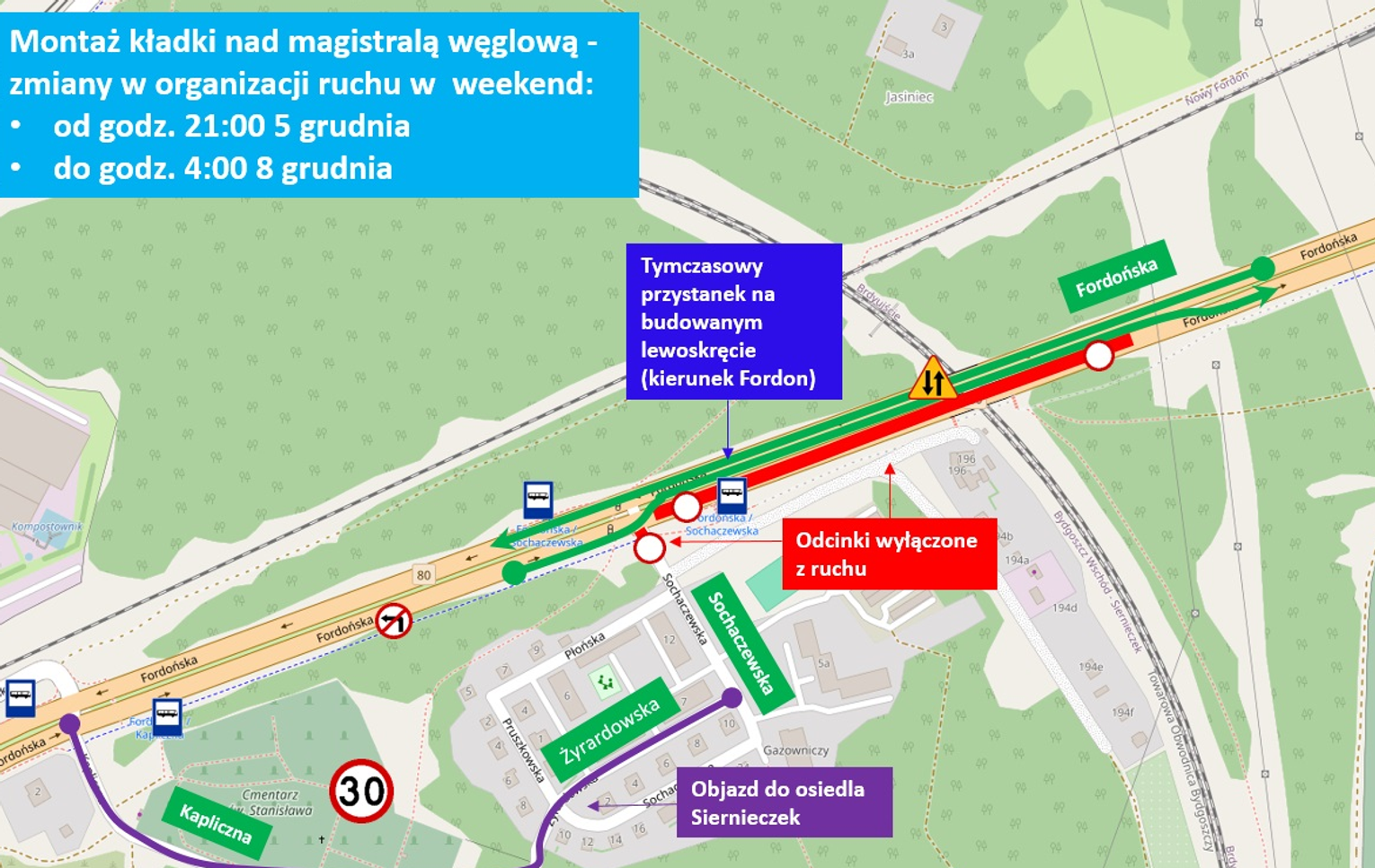 Przejazd planowany jest w piątek, 5 grudnia, w godzinach wieczornych; według harmonogramu transport ruszy około 21:00–22:00 i potrwa szacunkowo 2–3 godziny. Ze względu na gabaryty zestawu konieczne będzie czasowe zdemontowanie niektórych znaków drogowych, latarni oraz elementów sygnalizacji świetlnej, aby zapewnić bezpieczny przejazd przez newralgiczne odcinki miasta. Rozładunek i montaż kładki zaplanowano na jezdni południowej ulicy Fordońskiej, która w czasie tych prac będzie wyłączona z ruchu. Na jezdni północnej wprowadzony zostanie ruch dwukierunkowy. Zmiany w organizacji ruchu zaczną obowiązywać wieczorem w piątek, 5 grudnia, i potrwają do poniedziałku, 8 grudnia, do około godziny 4:00. Dodatkowo zamknięty będzie fragment ulicy Sochaczewskiej przy skrzyżowaniu z Fordońską. Dojazd na osiedle Siernieczek poprowadzono tymczasowo ulicami Kapliczną i Żyrardowską. Od soboty, 6 grudnia, całkowicie wstrzymany zostanie ruch pieszych na Fordońskiej na odcinku od ulicy Sochaczewskiej do Wiślanej; przejścia dla pieszych będą wyznaczone w innych miejscach zgodnie z oznakowaniem. Nowa kładka ma cztery metry szerokości, dzięki czemu komfortowo pomieści zarówno ruch pieszy, jak i rowerowy. Po zamontowaniu połączy istniejące i budowane odcinki ścieżek, poprawiając ciągłość tras i bezpieczeństwo użytkowników. Inwestycja wpisuje się w szerszy plan rozwoju infrastruktury rowerowej w mieście, mający zachęcić mieszkańców do korzystania z ekologicznych środków transportu. Projekt realizowany jest w systemie „zaprojektuj i wybuduj” przez firmę Kormost; wartość zadania przekracza 10 milionów złotych. Prace budowlane rozpoczęły się 1 października 2025 roku, a zakończenie inwestycji zaplanowano na początek 2026 roku.
