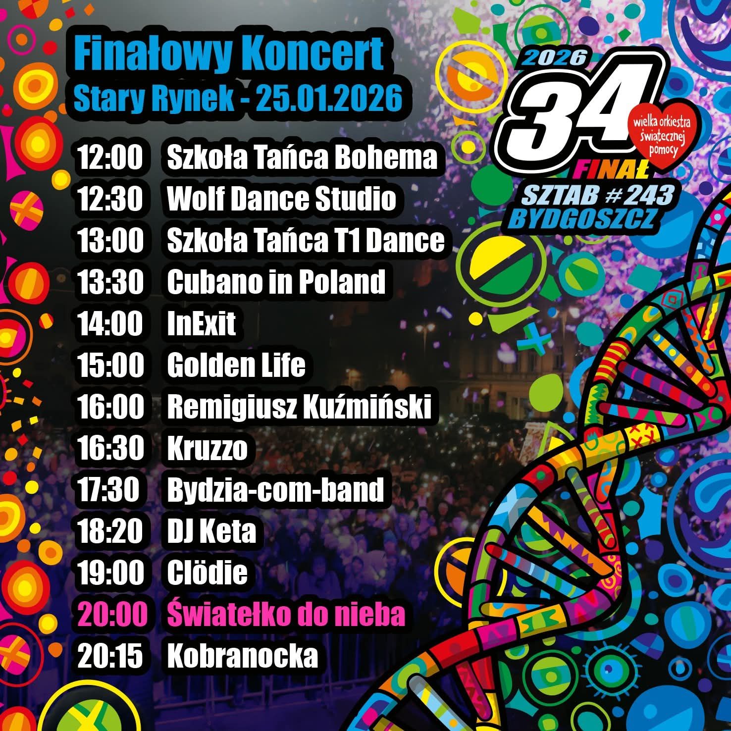 Już 25 stycznia 2026 roku na Starym Rynku w Bydgoszczy odbędzie się emocjonujący finał 34. edycji Wielkiej Orkiestry Świątecznej Pomocy. Wydarzenie zgromadzi nie tylko mieszkańców, ale i turystów, którzy będą mieli okazję uczestniczyć w niesamowitym programie. Występy rozpoczną się już o godzinie 12:00, a na scenie zaprezentują się znane zespoły i artyści, w tym T1 Dance, Szkoła Tańca Cubano, Golden Life oraz wiele innych.