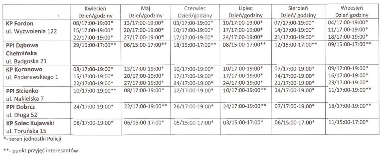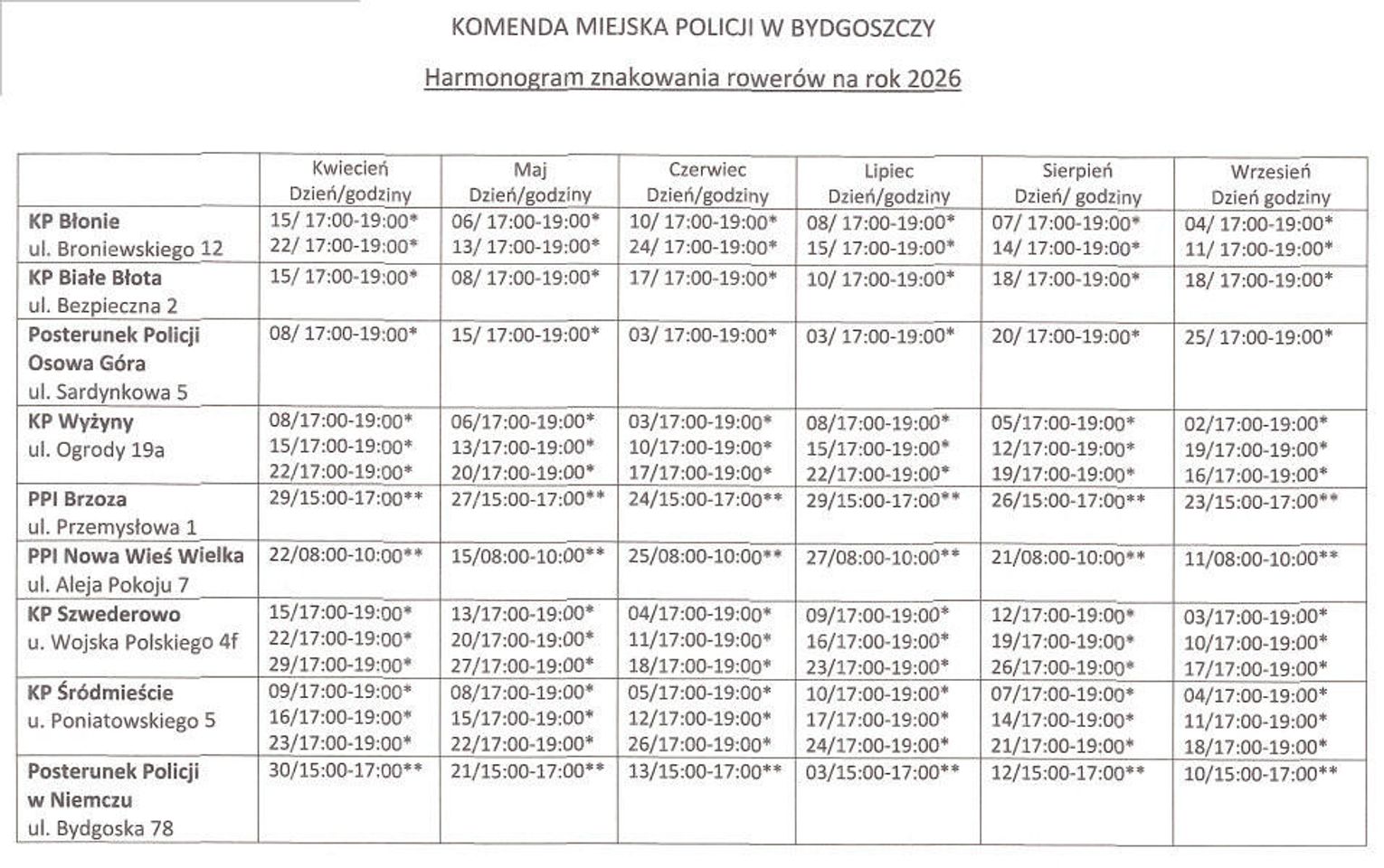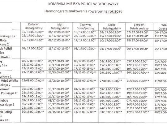 Harmonogram znakowania rowerów można znaleźć w zakładce PREWENCJA na stronie internetowej Komendy Miejskiej Policji w Bydgoszczy: www.bydgoszcz.policja.gov.pl lub bezpośrednio pod linkiem: https://bydgoszcz.policja.gov.pl/kb1/prewencja/znakowanie-rowerow-2026-rok/179,ZNAKOWANIE-ROWEROW-2026-ROK.html.